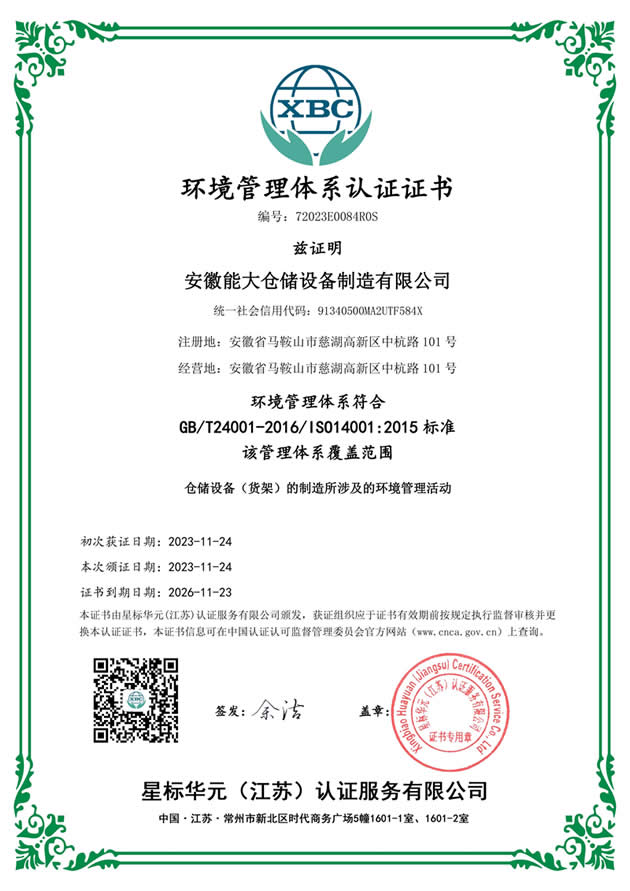 能大仓储货架环境管理体系认证证书