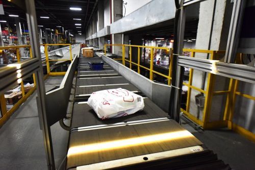 打包好的商品会重新回到传送带上,被送至分拣系统。系统通过扫描识别包裹上的配送地点,会将包裹传送至相对应的货道,然后由工作人员运走进行发货。