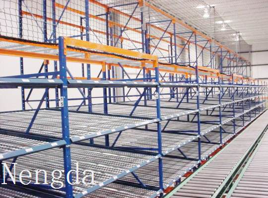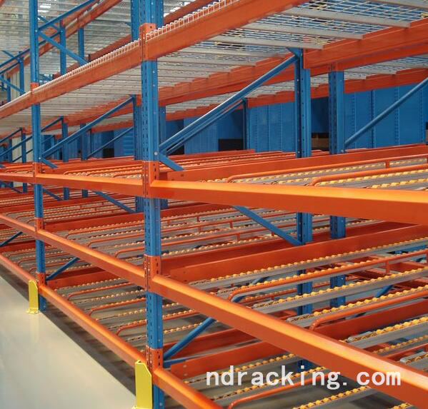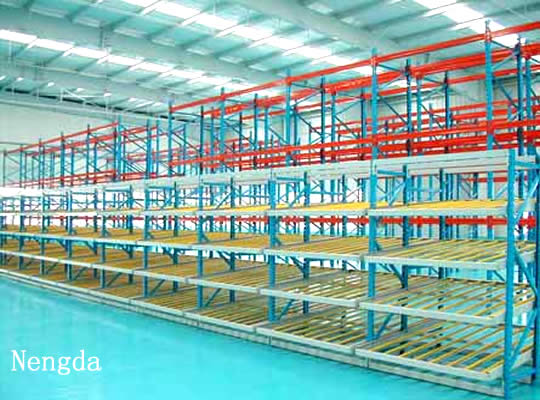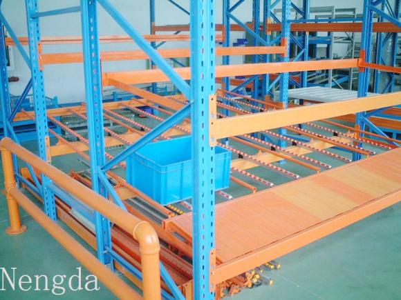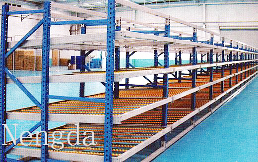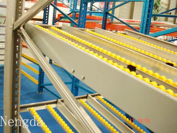 03、货架每层前后横梁之间架置滚轮式镀锌或铝合金流利条,按一定坡度(3°左右)放置。货物通常为纸箱或将货物放在塑料周转箱内,利用其自重实现货物的流动和先进先出,货物由小车进行运送,人工存取,存取方便。