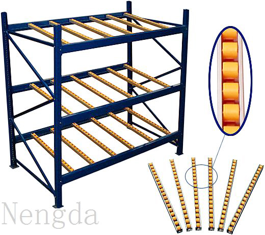 流利货架又称滚轮式货架、滑移式货架。这种类型的货架利用货物自身的重量自行下滑,货物先进先出,适于大批量同类货物的存储,适用于生产线或装配线上物料的存放,货物至于滚轮上,利用一边通道存货,另一边通道取货。滚轮式货架流利条货架自滑式货架的料架朝出货方向倾斜,货物在重力的方向作用下沿滚轮向下滑动;可实现先进先出,并可实现一次补货,多次练货。