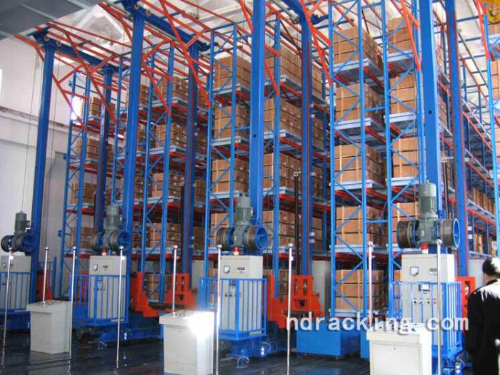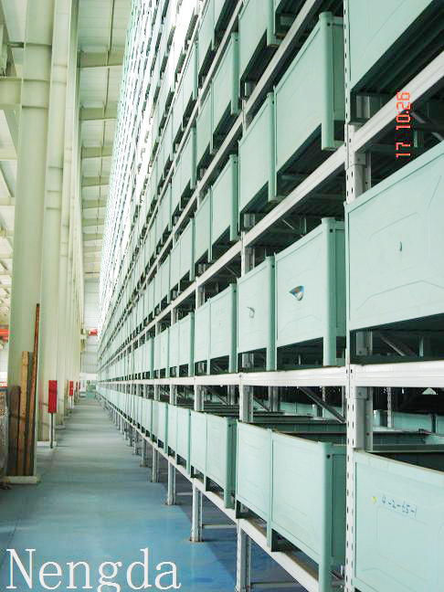 贯通式立体仓库:又称流动型货架仓库,贯通式立体仓库是—种密集型的仓库,这种仓库货架之间没有间隔,不留通道,货架紧靠在一起,实际上成了一个货架组合整体。这种货架独特之处在于,每层货架的每一列纵向贯通,象一条条隧道,隧道中能依次放入货物单元,使货物单元排成一列。货架结构一端高一端低,使贯通的通道成一定坡度。在每层货架底部安装滑道、辊道或在货物单元装备(如货箱、托盘)底部安装轮子,则货物单元便可在其自身重力作用下沿坡道高端自动向低端运动。如果单元货物容器有自行运行机构,或货架中安装相应机构,货架也可水平安装而不需坡度。